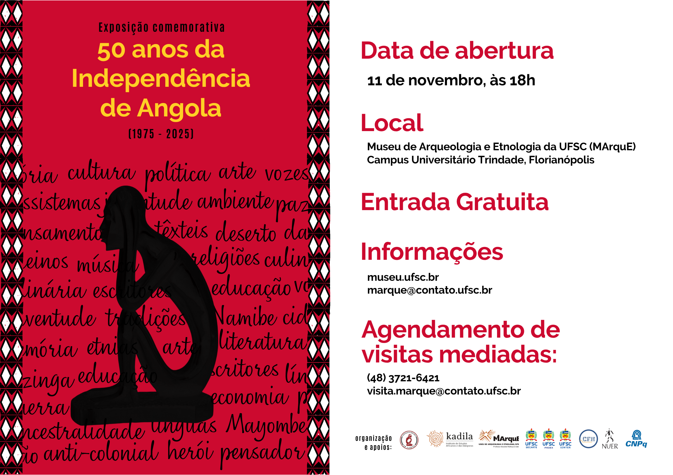 A exposição comemorativa “50 anos da Independência de Angola” será inaugurada nesta terça-feira, 11 de novembro, às 18h, no Museu de Arqueologia e Etnologia da Universidade Federal de Santa Catarina (MArquE/UFSC). A exposição apresenta aspectos da história de Angola, a guerra colonial, a guerra civil e a Independência em 1975. Traz também aspectos relevantes do país independente até a atualidade, tais como a geografia e as riquezas naturais, aspectos da vida social e cultural, as línguas e etnias, a questão educacional, a literatura, a música, a culinária, a urbanidade, entre outros.