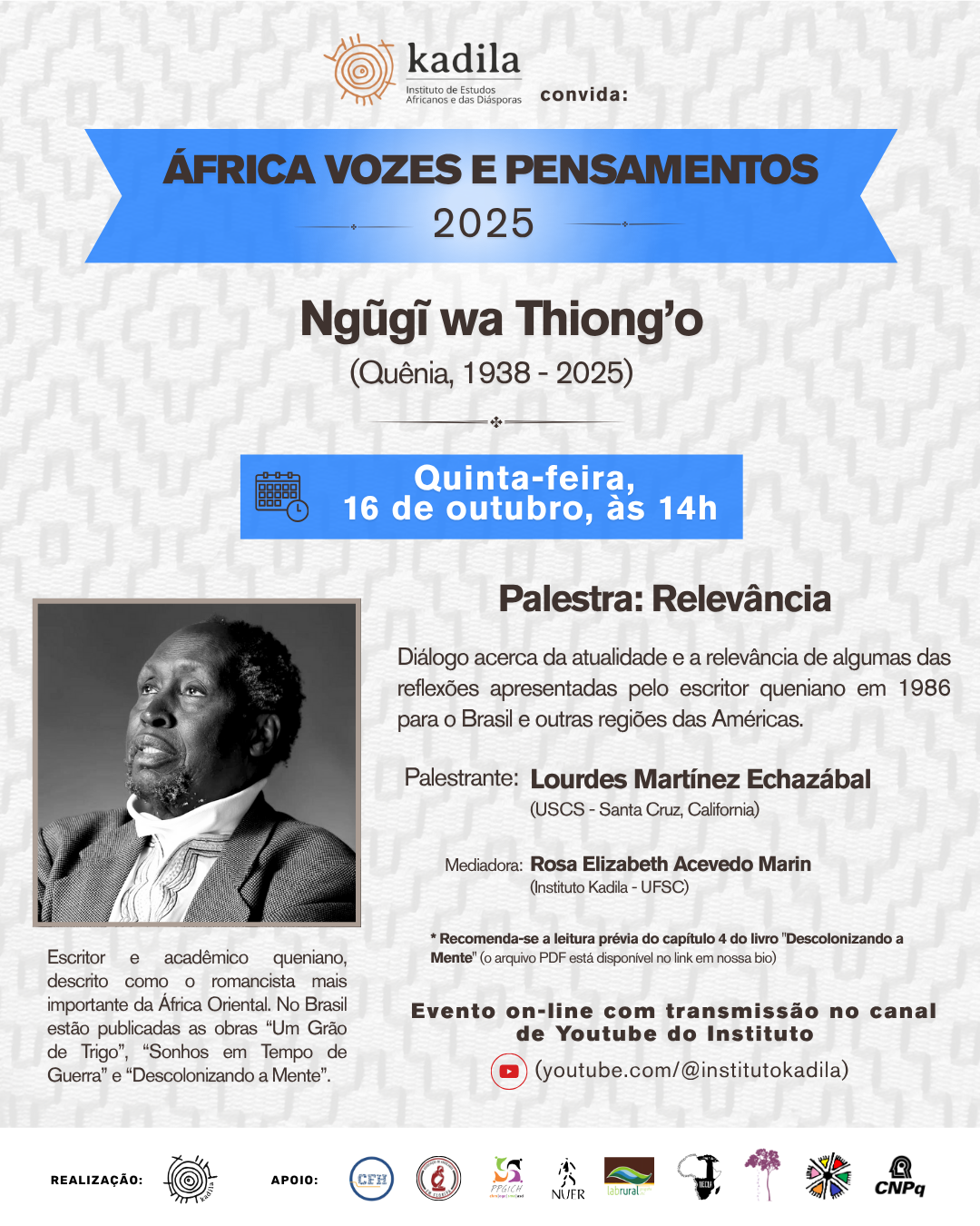 ‼️ Amanhã, dia 16 de outubro, às 14h, como parte do evento África Vozes e Pensamentos 2025, o Instituto Kadila transmitirá a palestra Relevância, uma homenagem ao escritor queniano Ngugi wa Thiong’o. A proposta é dialogar acerca da atualidade e relevância de alguma reflexões apresentadas pelo escritor em 1986, na obra Descolonizando a Mente, para o Brasil e outras regiões das Américas.